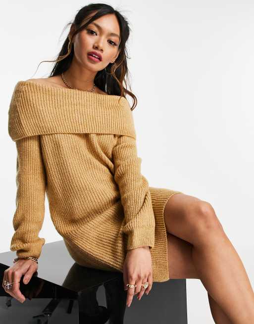 Cream Chunky Knitted Bardot Dress Knitwear PrettyLittleThing QA