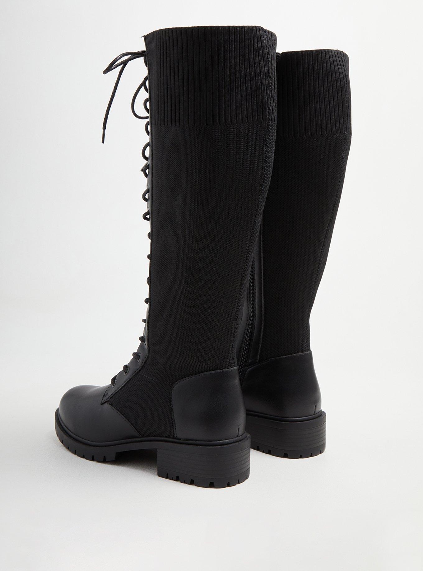 Plus Size Stretch Knit Combat Knee Boot Black Faux Leather (WW