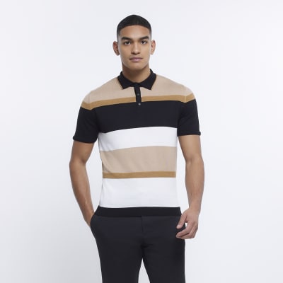 Brown Slim fit colour block knit polo shirt River Island