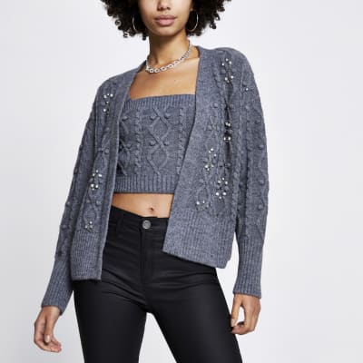 Grey embellished knit cardigan and bralet set River Island