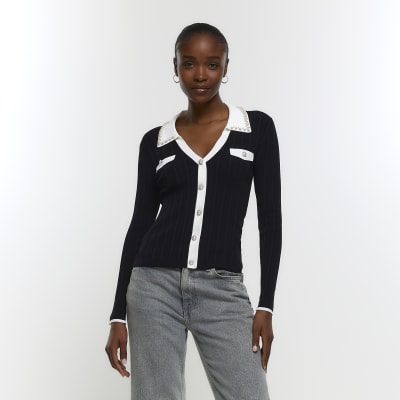 Black knitted pearl collar jumper River Island