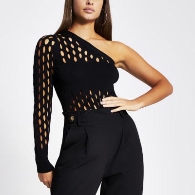Black mesh one shoulder knitted top River Island