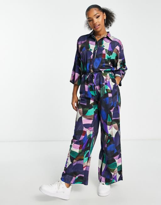 Monki long sleeve jumpsuit with collar in abstract print ASOS