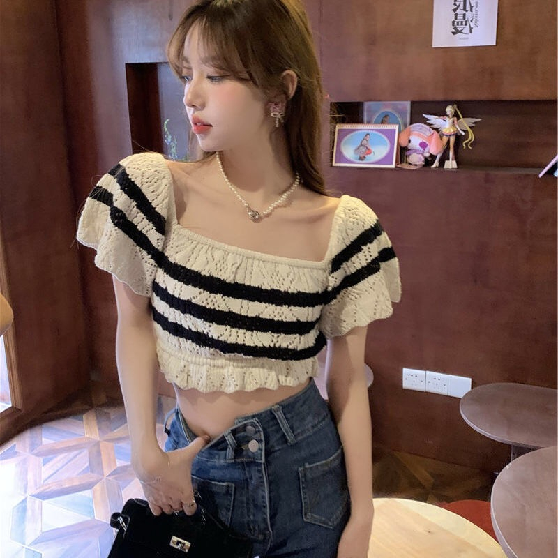 Riya Fashion cute stripe summer knitted top semi crop top square neck