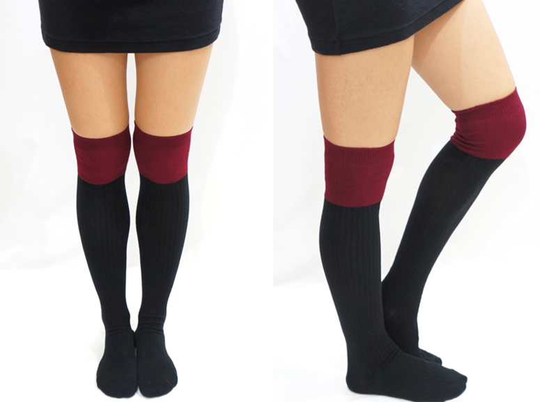 Two Tone Knitted Thigh High Socks Burgundy/Black on Luulla